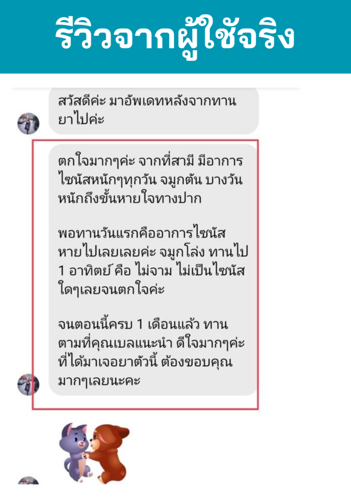 หน่อยทานวันละ 1 เม็ดก่อนนอน หลังทานได้ 1 สัปดาห์ รู้สึกอาการดีขึ้น หายใจสะดวกขึ้น นอนหลับสบายขึ้น น้ำมูกลดลง จมูกไม่มีกลิ่นคาว หน่อยแปลกใจมาก เพราะเพิ่งทานไปแค่ 1 สัปดาห์เท่านั้นและทานต่อเนื่องอาการก็ดีขึ้นตามลำดับ