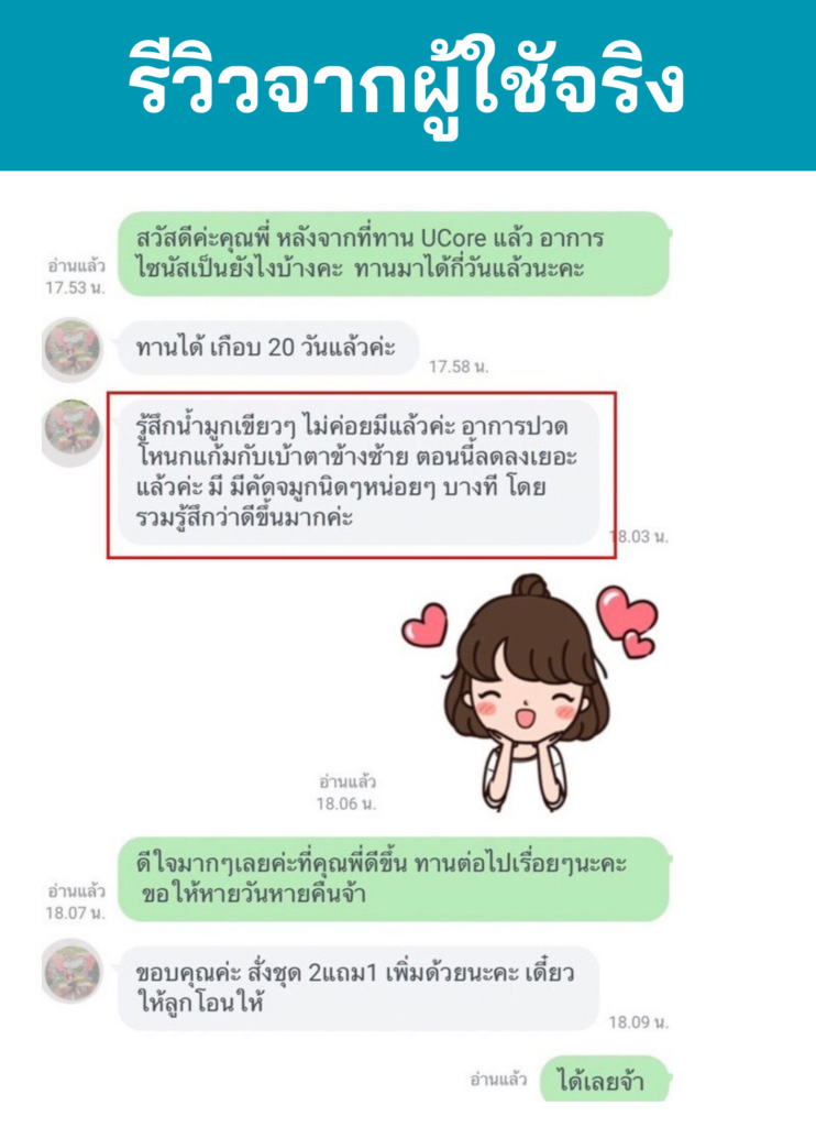 ท่านใดที่กำลังทรมานกับไซนัสอักเสบเหมือนหน่อยอยู่ หน่อยแนะนำเลยนะคะ UCore ใช้แล้วได้ผลกับตัวเองชัดเจนมาก ไม่ต้องไปลองผิด ลองถูกให้เสียเงิน เสียเวลา อีกต่อไป ยิ่งปล่อยไว้ยิ่งทรมาน หน่อยเป็นกำลังใจให้ค่ะ